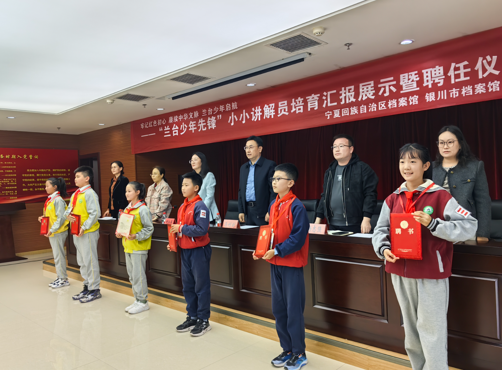 活动中,经过银川市档案馆爱国主义教育基地系统培训的22位优秀的中小学生作了精彩的汇报展示,并正式受聘为“兰台少年先锋”小小讲解员。接下来,他们将以青少年独特视角,立足银川市档案馆爱国主义教育基地,成为档案故事的传承者与实践者,面向公众讲述红色档案背后的故事。